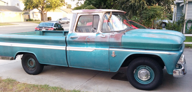 A 1963 Chevy C10 Pickup with a 250 CID straight six engine connected to a Muncie 3 speed manual transmission.